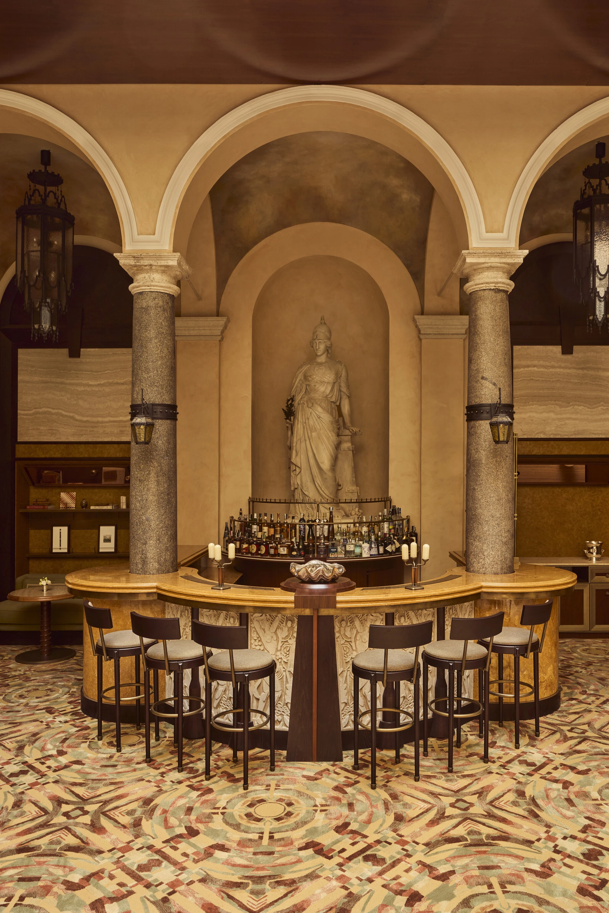 The restoration of the property preserves original elements like the statue of Minerva and marble columns, set beneath a newly installed glass-domed drawing room that serves as the vibrant hotel bar lobby.